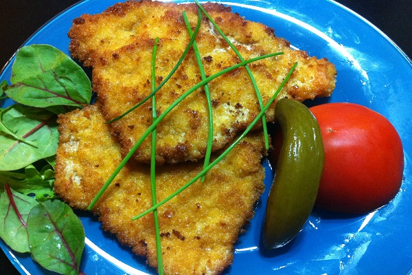 Солим и перчим мясо уже при подаче. Это основное условие для того, чтобы наш шницель получился не только хрустящим снаружи, но и сочным внутри. По-моему, все получилось! Приятного Вам аппетита!