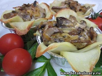 Пока печется картофель подготавливаем грибы. На смеси сливочного и растительного масел обжариваем до золотистого цвета лук и добавляем к нему грибы. Сразу солим и перчим и обжариваем пока не выпариться из грибов жидкость и они не начнут аппетитно румяниться Обычно на все это священнодействие уходит минут 15-20)
