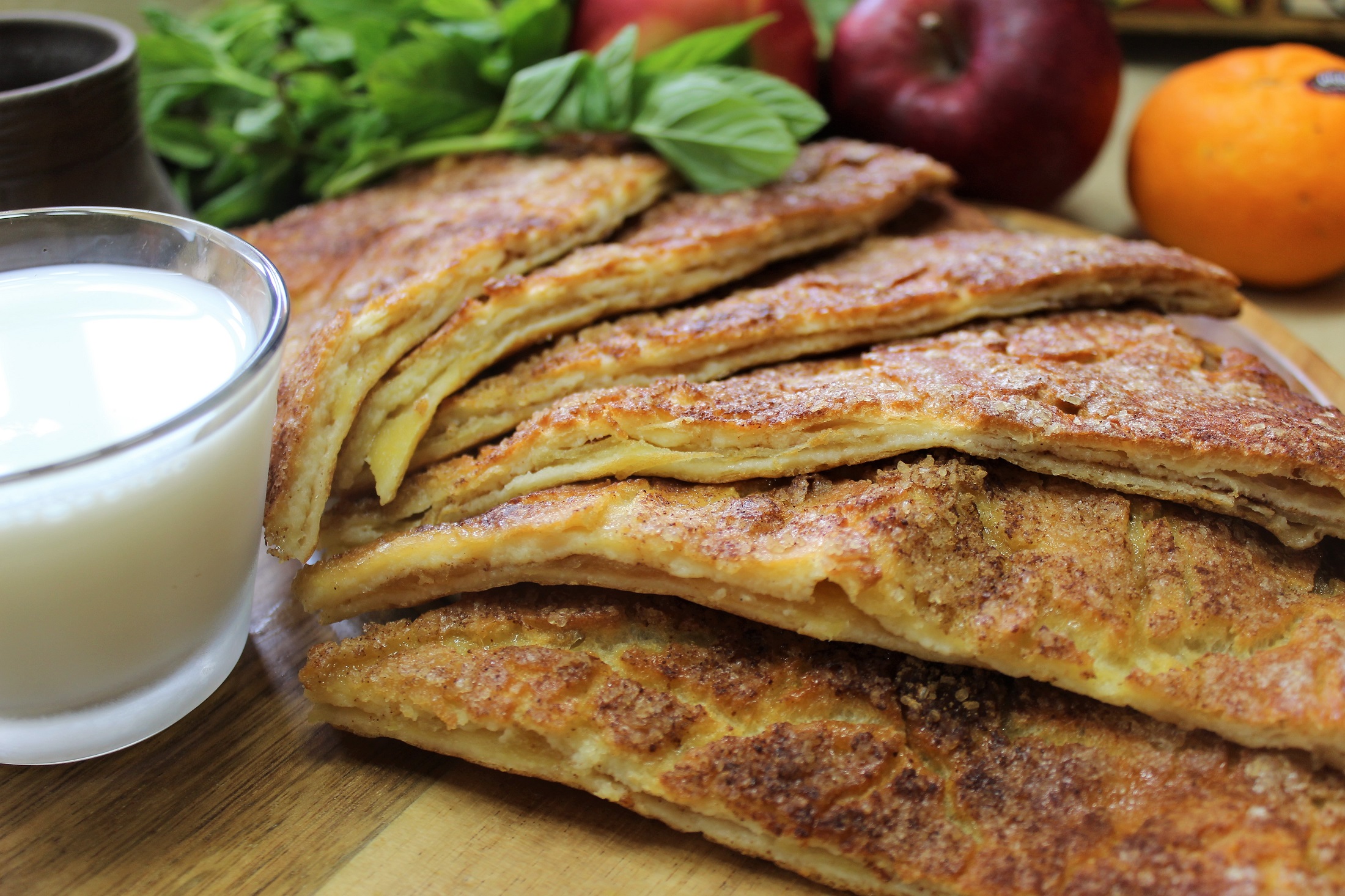 при помощи рук или смоченной в воде или растительном масле ложки размазываем в лепешку приблизительно 2-4 мм толщиной. Выкладываем слой яблок, присыпаем их сахаром и корицей