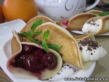 Всего их этого количества продуктов у меня получается 16 блинчиков, которые все таки желательно выкладывать не друг на друга, чтобы они не склеивались. Пожаренные блины, сложив пополам, защипываем, превращая их в трубочку, или, скорее рожок. И начиняем вишней... или заварным кремом.