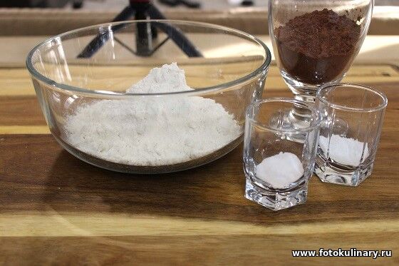 Как и любой кекс, этот тоже готовиться молниеносно. Значит его приготовление будем начинать с того, что включим разогреваться духовку на 180 градусов. Отдельно смешаем муку с какао порошком, содой, солью и разрыхлителем.
