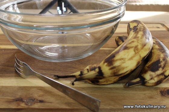 Отдельно в замесочной миске вилкой или картофельной толкушкой разомнем бананы