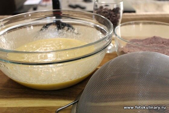 Теперь через ситечко соединим обе смеси и перемешаем их с помощью лопатки.
