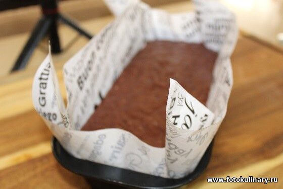 Осталось только вмешать сюда колотый шоколад, перелить все в форму, застеленную пекарской бумагой и в духовку.