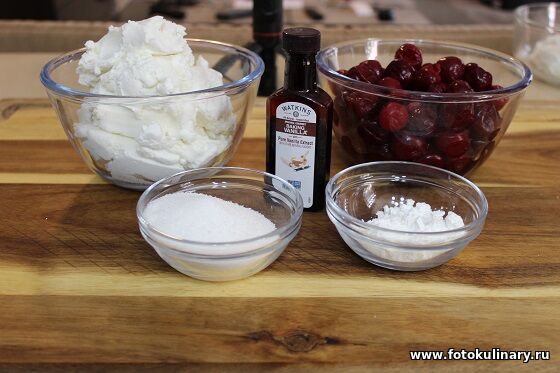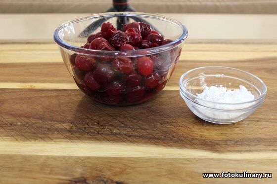 раз в это время можно подготовить начинку и заливку. И начнем их приготовление с того, что смешаем вишню (свежую, или размороженную) с крахмалом.