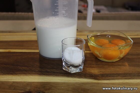 Итак. Конечно для начала блинное тесто. В отдельной емкости (желательно в ковшике с носиком) перемешиваем сахар с яйцами и молоком. Желательно, чтобы сахар растворился.