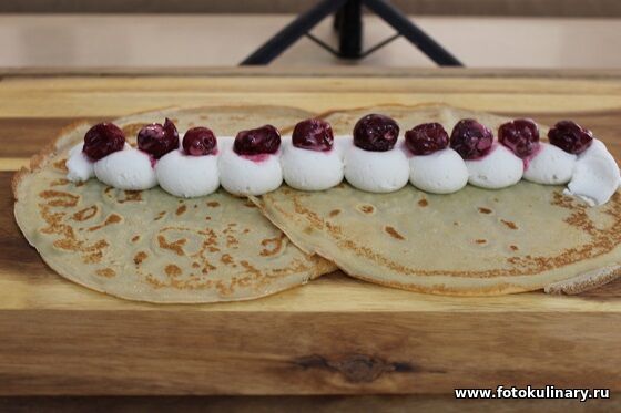 по центру выкладываем творожную начинку и вишню.