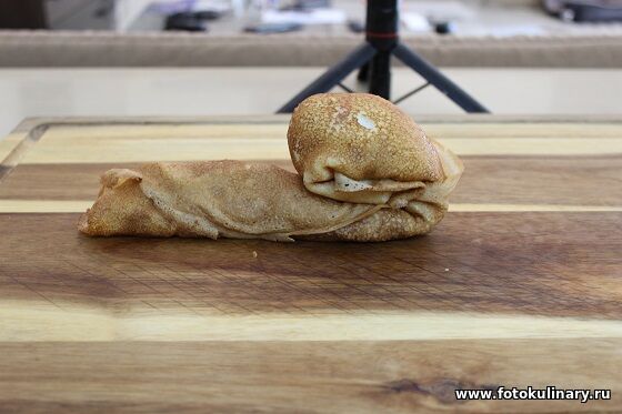 Закрываем начинку блинами с обеих сторон и сворачиваем в улитку,