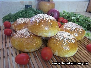 Духовку ставим греться на 200 градусовю Подошедшие булочки смазываем разболтанным с молоком желтком, присыпаем кунжутом и отправляем в духовку минут на 30.