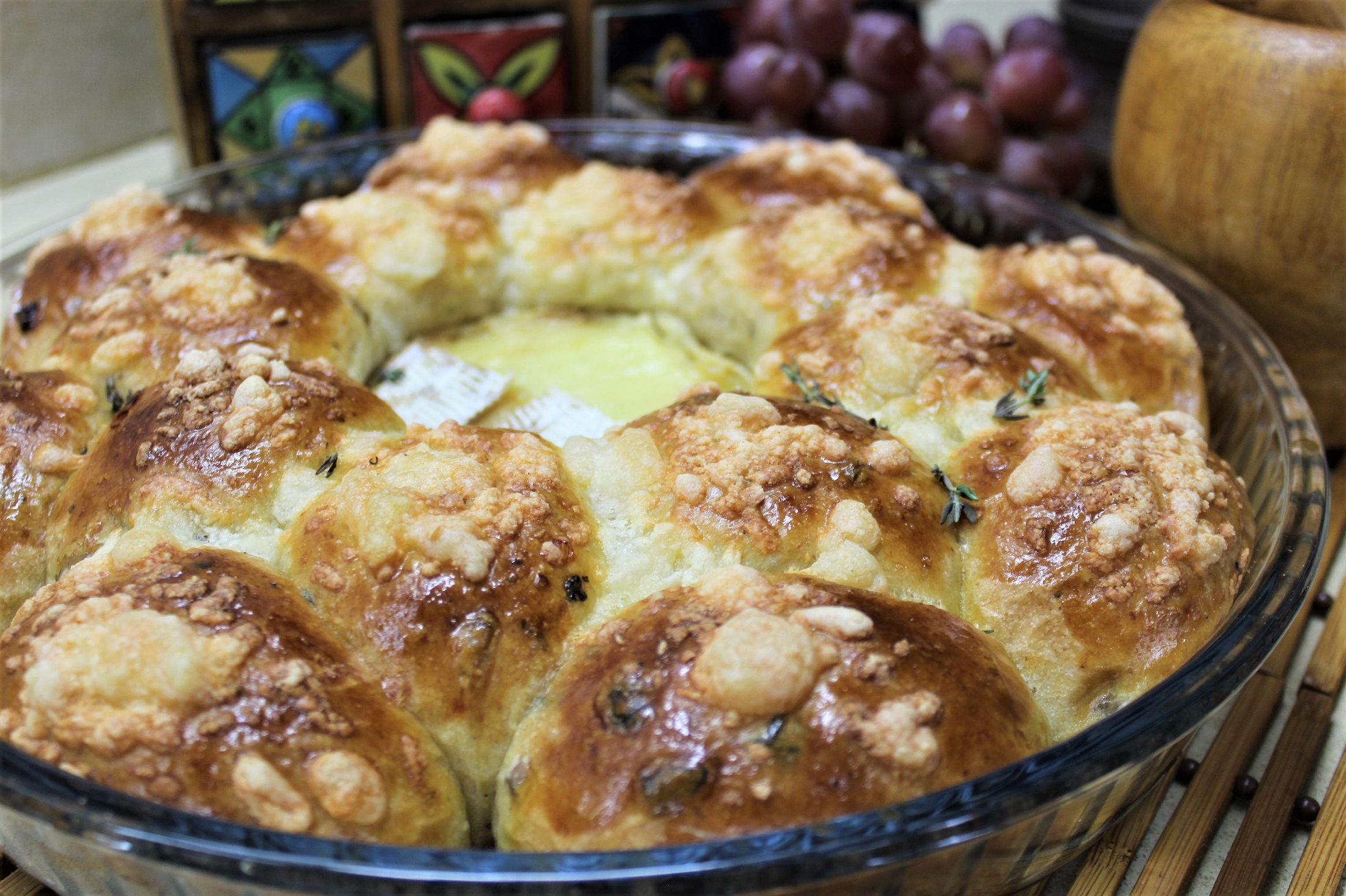 А теперь к булочкам. Делим тесто на 16 одинаковых кусочков. Каждый подкатываем в шарик - булочку. Выкладываем в смазанный сливочным маслом (чтобы снизу корочка пропиталась при выпечке и стала сливочно хрустящей, почти как у гренки) противень, вокруг гордо водруженного в самом центе сыра камамбер. Даем под пленкой булочкам отдохнуть еще минут 10-15. За это время включаем разогреваться духовку на 180 градусов.