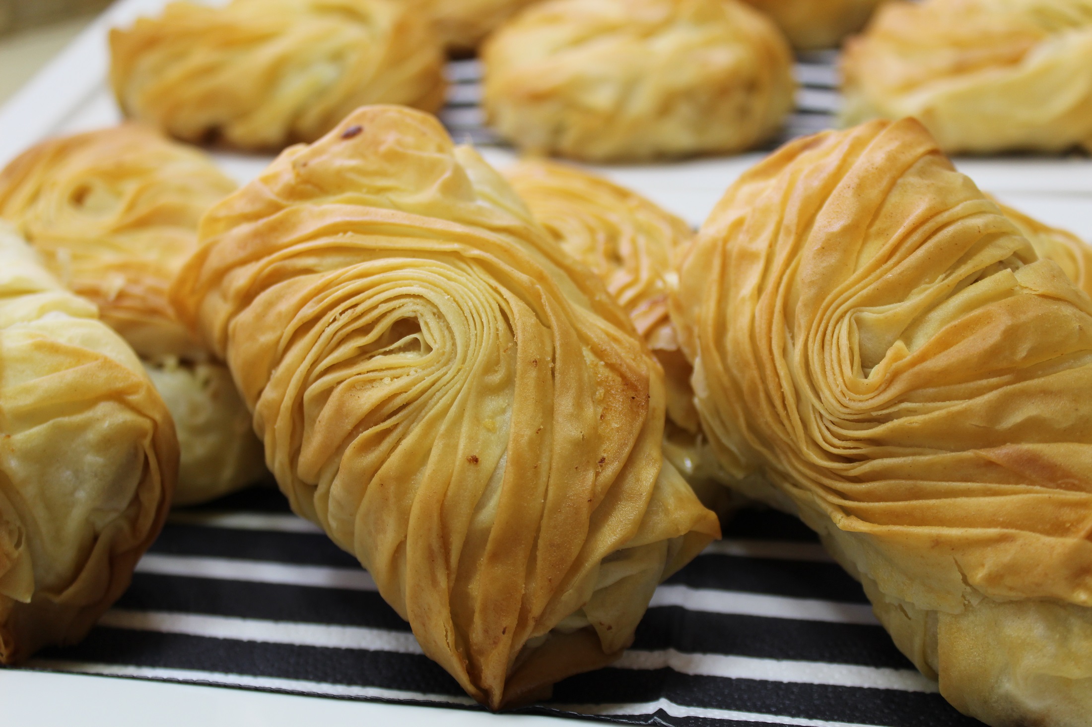 Кладем на этот "нахлест" начинку, чуть отступив от края. Подвернем с боков и скрутим как фаршированный блинчик. И вот еще один вариант красивого, слоистого бурекаса готов.