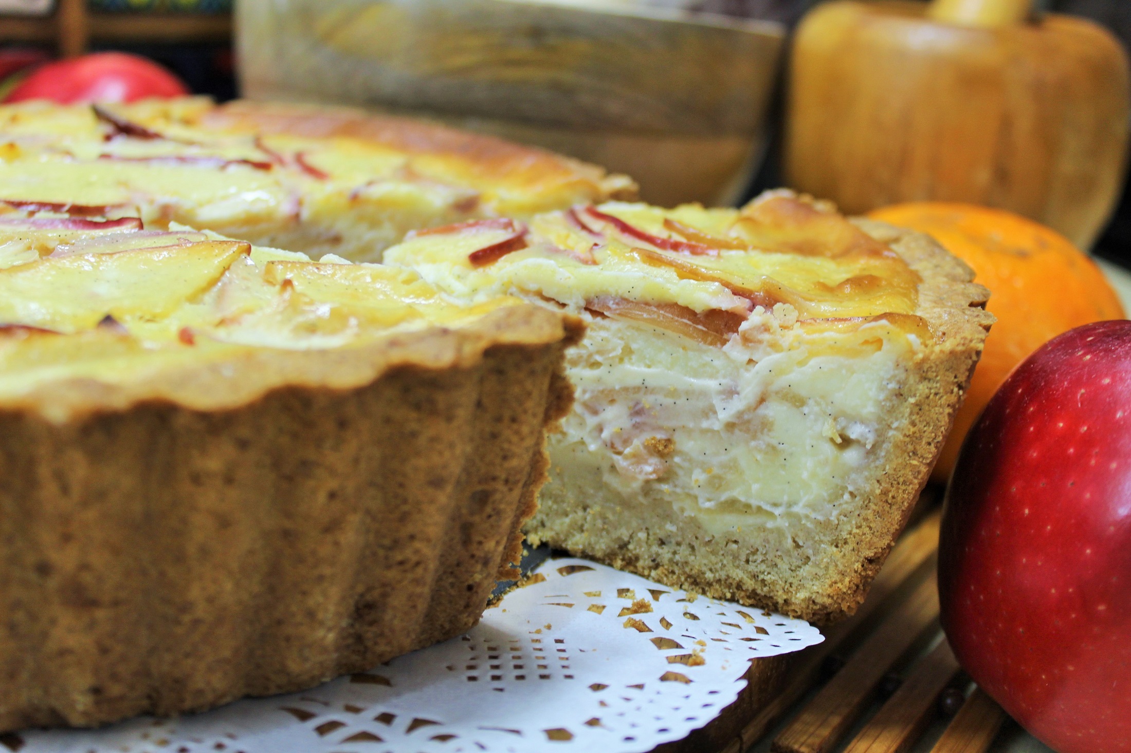 На дно охлажденной формы с тестом выкладываем половину яблок (желательно проследить, чтобы пласты яблок располагались параллельно дну формы, так разрез будет аккуратнее и красивее) и заливаем половиной заливки, встряхиваем, помогая заливки просочиться через яблоки к (звездам) тесту