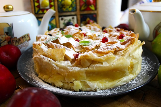 На полученную основу выкладываем (переливаем) сырную начинку, сверху ее еще пару промазанных маслом пласта фило, далее слой ягод. Их прикрываем смятыми листами фило и свисающие края подворачиваем наверх, закрывая пустоты и формуя "кружевной" верх.