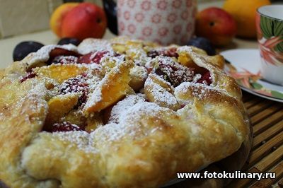 На дно выкладываем покрошенные на всяко разные кусочки савоярди. Сверху мытые обсушенные, обескосточенные порезанные на дольки фрукты. Присыпаем сахаром и сворачиваем пустые края теста сверху на начинку, формируя ту самую галету.