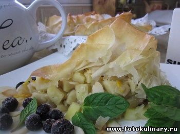 Быстренько доделываем маринованную начинку. Добавляем туда оставшийся сахар, цедру лимона и апельсина и горсточку миндальных хлопьев, перемешиваем и выкладываем в форму с тестом. Сверху укладываем пару тройку листов теста фило. Кладем нежно, не разглаживая, а скорее наоборот, как мятый, скомканный лист бумаги.