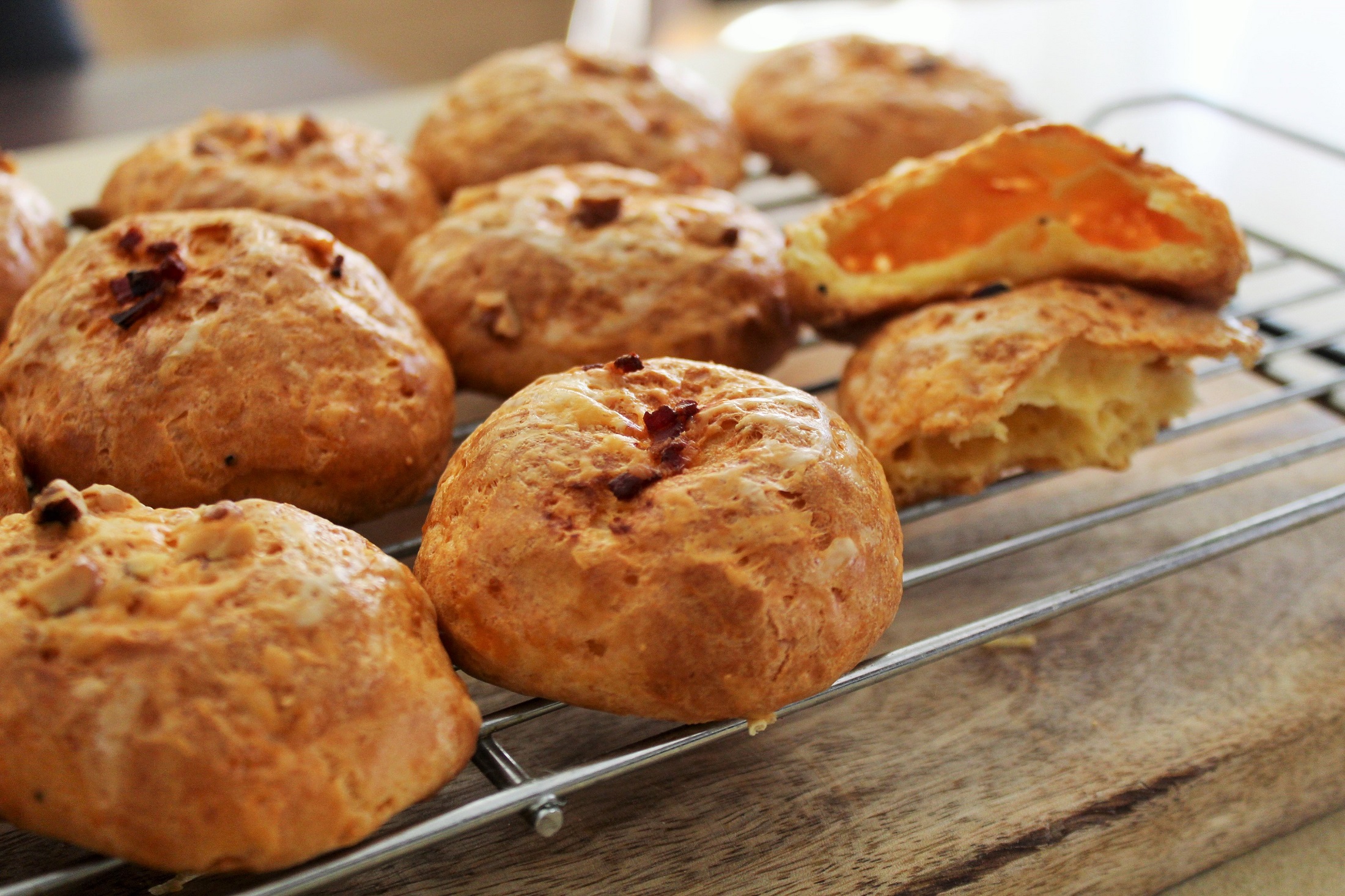 В результате получается гладкое, блестящее, стекающее с ложки лентой заварное тесто в которое добавляем и вмешиваем подготовленный тертый сыр, оставив немного на посыпку сверху.