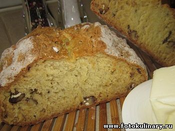 Если уж согласиться с утверждением, что о стране и о народе этой страны можно составить впечатление попробовав их "национальный" хлеб, то этот хлебушек говорит о ирландцах весьма и весьма красноречиво. Эдакий северный народ, делающий все споро, но неторопливо и добротно... если уж работать, то работать... если пахать, так пахать... кушать, так кушать... сытно и естественно вкусно... при этом весьма желательно на готовку потратить минимум сил и времени. Есть что то очень основательное и в ирландском хлебе, и традиционном ирландском рагу, и уж, конечно, в пюре и картошки в любом другом своем прекрасном проявлении. Лично мне очень импонирует тот образ ирландца, который я себе придумала, делая и кушая этот самый содовый хлеб. Просто удивительно, что уже очень много лет (скорее даже столетий) люди за считанные минуты, до сих пор используя именно соду (ну, первоначально, конечно, даже не соду, а золу), а не дрожжи замешивают и пекут этот очень традиционный, не привычный и очень вкусный хлеб. Итак для одной средней буханочки берем: на 450 граммов муки надо по 1 чайной ложки соли и соды, 400 миллилитров пахты (которую за неимением смело заменяем на 2 столовые ложки яблочного уксуса и 360 мл. молока) и горсточку грецких орешек и немного буквально чайную ложечку сахара. (Даже не сомневаюсь, что необходимости пояснять, что последний ингредиент отнюдь не ключевой и с совершенно чистой совестью либо опускается, либо заменяется на сушенную клюкву, изюм, семена кориандра. тмина, на розмарин или еще что нибудь приятное и вкусное лично Вам).