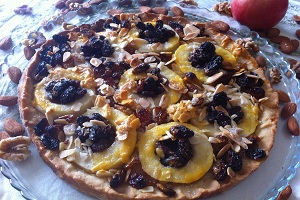 Очень гармоничное сочетание печенного яблока, запеченного изюма, обжаренных орешек и рассыпчатого, нежного песочного теста. Надо брать! Надо: песочное тесто (подробный рецепт на песочное тесто). изюм темный и светлый грамм по 100, миндальные хлопья - грамм 50-70, 2 яблока, немного белого сухого вина, половинка лимона, пара столовых ложек сахара и 1 яйцо для смазывания.