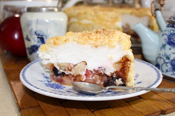 Собрать пирог. После теста с бортиками кладем яблочный слой, на него слой суфле
