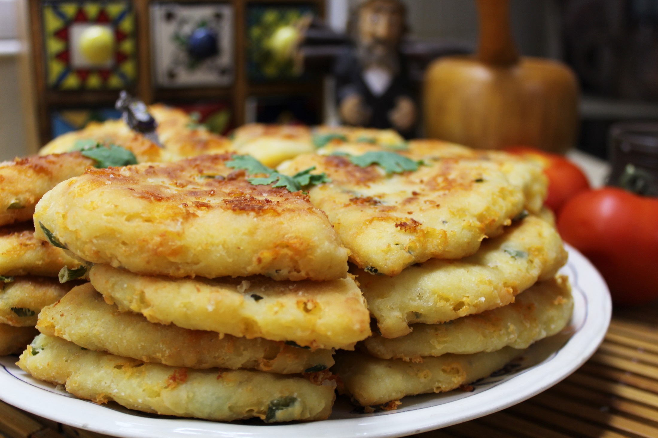 круглую лепешку толщиной 4-7 мм, диаметром, чуть меньше, чем сковорода, в которой Вы собираетесь ее жарить и разделяем ее на 6 или 8 частей.