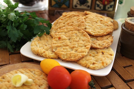 На тонко (мм 3-4) раскатанном тесте делаем частые проколы и вырубкой для круглых печений, или ножом для пиццы для прямоугольных вырезаем заготовки, которые перекладываем на застеленный пекарской бумагой противень и несем выпекать в разогретую на 180 градусов духовку. Минут на 12-14 (зависит и от Вашей плиты и от того, на сколько хрустящие печенья Вы холите получить в результате.