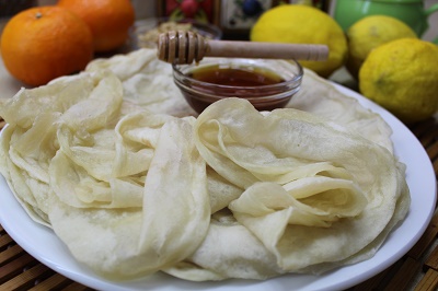 Выкладываем его (блин) на сухую разогретую сковороду и обжариваем с двух сторон. Как только поворачиваем на вторую сторону начинаем растягивать, подготавливать второй кусочек, превращая его в такой же тонкий блин