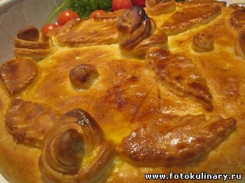 Промазываем желтком смешанным с молоком делаем проколы ножом, или вилкой в верхнем слое пирога, чтобы выходил пар и не отмокала верхняя корочка и выпекаем в разогретой до 200 градусов духовке минут 30-40.