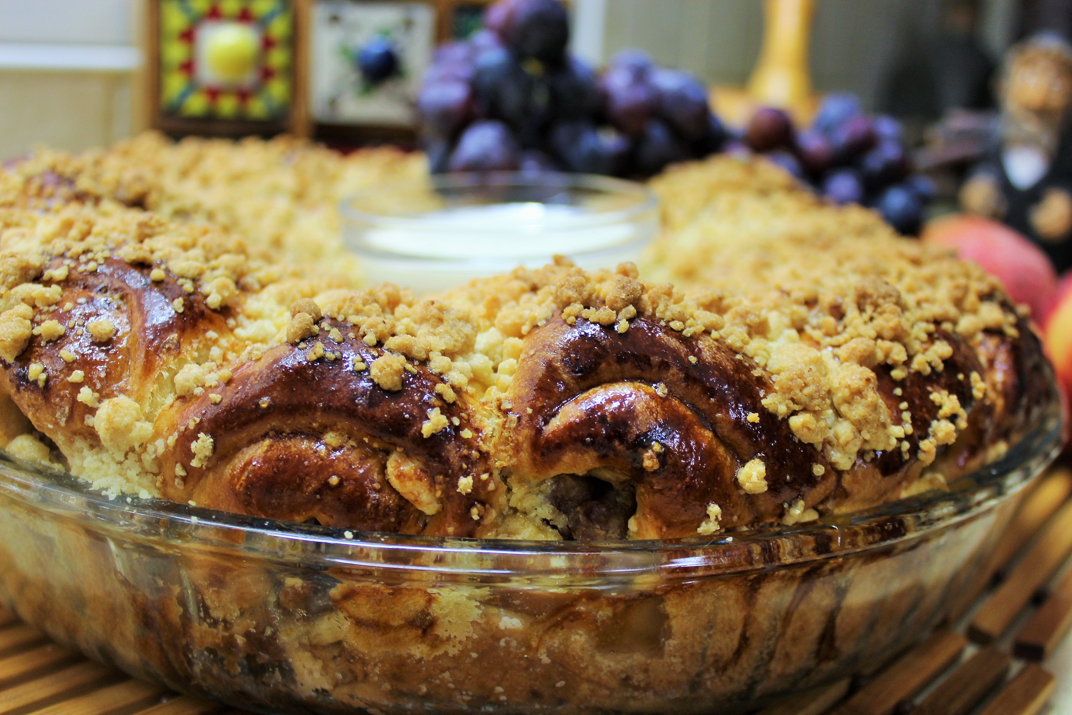 Каждую заготовку раскатываем в лепешку чуть меньшего диаметра, чем форма в которой будем выпекать.. На половину лепешки выкладываем немного штрейзеля