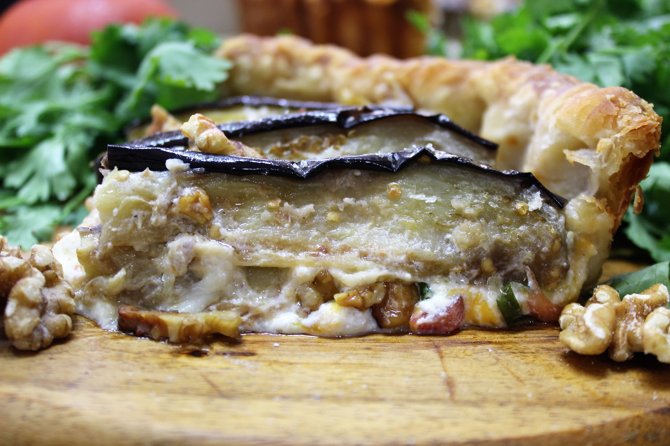 Пирог можно подавать и горячим и остывшим. Тесто все равно остается рассыпчатым и хрумким, начинка очень ароматной, тягуче сырным, с привкусом чесночка, неожиданными солоноватыми "комочками" феты и вдруг стреляющей ноткой перечной остроты, вместе с шелковистой мякотью печенного баклажана и орешками - это сказочно вкусно. Все любители сыра, присоединяйтесь. И приятного нам аппетита!