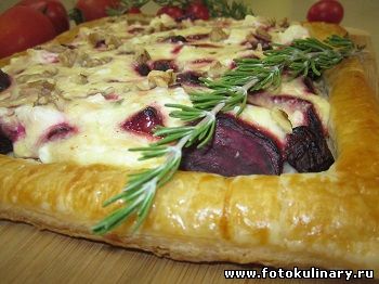 Затем эту заливку распределяем по свекле в чуть зазолотившемся уже пироге, при желании присыпаем сверху орешками и несем пирог допекаться до готовности еще минут на 15-20.