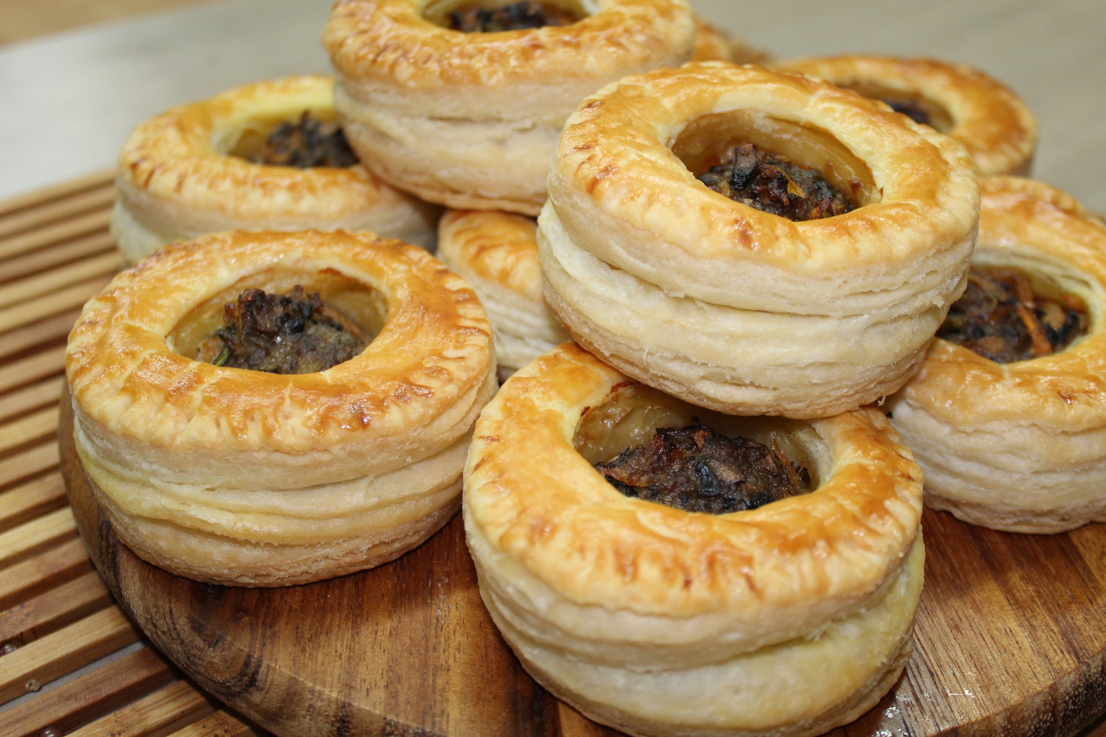 Слоеное тесто раскатываем в пласт около 3-5 мм толщиной и делаем вырубкой круглые заготовки (придется параллельно подсчитать,чтобы количество заготовок было четным... Фраза так себе получилась!.. с претензией! А что делать? каждый пирожок то состоит из 2 частей... Надо соответствовать!)