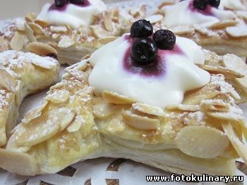 Подробный рецепт на слоеное тесто быстрого приготовления либо обычное слоеное тесто, причем можно и покупное. (а кто осудит?), один желток и немного молока для смазывания, столовую ложку сахара (коричневый в данном случае предпочтительней), и миндальная стружка для присыпки.