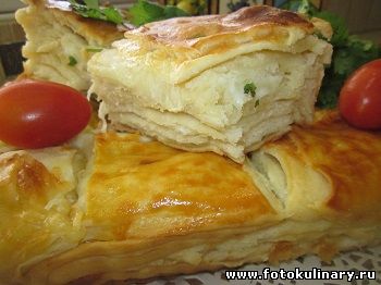 и присыпаем сыром (одной пятой частью от всего подготовленного сыра), следующий слой выкладываем сверху и тоже промазываем маслом, на него сыр не кладем, а кладем следующий пласт теста, который опять таки смазываем маслом и как и первый слой просыпаем сыром... и так дальше конца, промазывая маслом каждый слой и присыпая сыром через один слой (итого присыпанных сыром 5 слоев) собираем весь пирог до конца.
