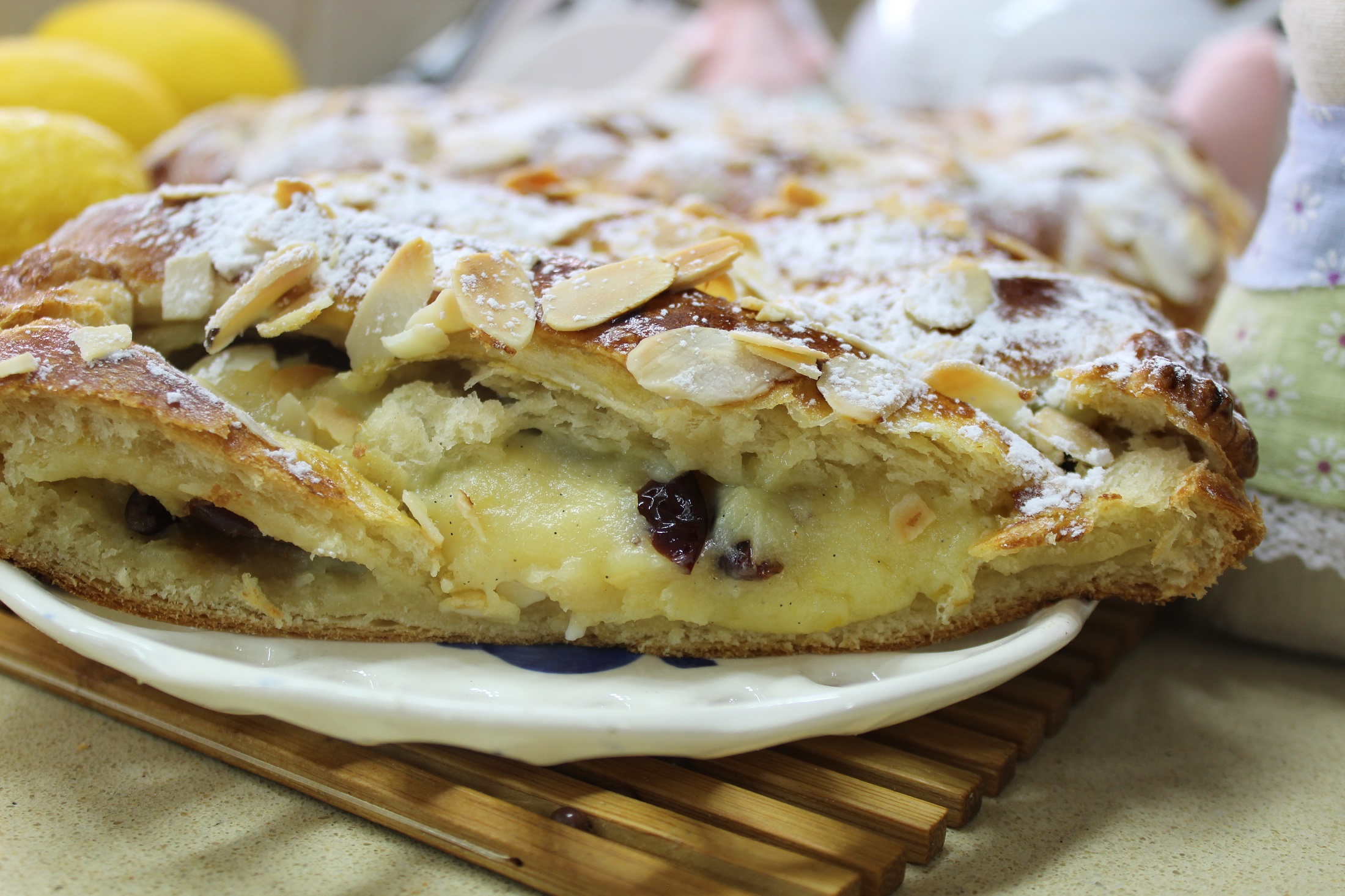Готовое тесто раскатываем в прямоугольный пласт. Мысленно делим его на 3 части. На среднюю треть выкладываем остывший заварной крем, сверху и с низу оставляем свободные места. Боковые трети надрезаем на симметричные полоски