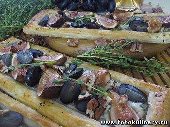 Пока запекаются слойки подготавливаем фрукты. Орешки крошим не слишком мелко, чтобы и на глаз видно и на укус - ощутимо. Виноград режем пополам (если есть косточки, тяжко вздыхаем, но убираем). Инжир нарезаем на 4 дольки.