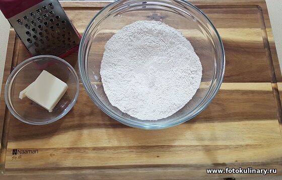 Теперь к муке натираем холодное сливочное масло и быстро руками перетираем в мелкую однородную крошку.