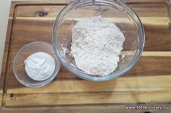 Добавляем кефир (или йогурт) и быстро замешиваем тесто, как только оно собралось в один комок, оно готово. Заворачиваем в пленку и в холодильник минимум на пол часа.