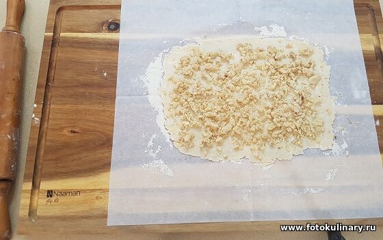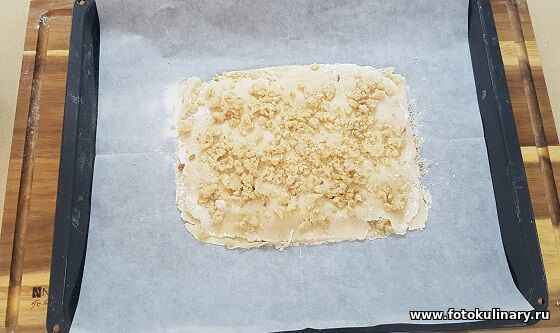 Как тесто отдохнуло, делим его на 6 одинаковых частей. Каждую раскатываем в тонкий прямоугольный пласт и присыпаем начинкой.