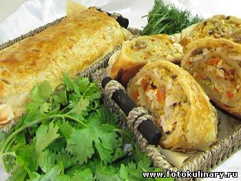 Чем привлекательны такие блюда, так это тем, что на изготовление его не надо ничего покупать специально. Если есть у Вас в холодильнике слоеное тесто (а на всякий... категорически считаю, что всегда надо иметь), то все остальное (в смысле начинка) придумывается и воплощается из того, что есть. Подходит все! (типа "танцуют все!"). Единственное условие, чтобы продукты не конфликтовали между собой, и хотя бы теоретически могли подружиться. Так что берем не количеством продуктов, а их сочетаемостью. И если для целого рулета у нас маловато, например, курицы, то смело добавляем ей объема, а параллельно и разнообразие вкуса, грибами и рисом. Или, недостаток в количестве свинины, смело компенсируем добавкой из квашеной капусты, или ограниченность говяжьего фарша, опять же, для примера, отварными яйцами с зеленью... В общем, да здравствует слоеное тесто... а все остальное приложится. Сегодня берем: пачка готового слоеного теста, парочка куриных окорочков, пол стакана риса, одна банка шампиньонов в собственном соку, одна небольшая луковица, 2-3 небольшие морковки, 3-4 столовые ложки панировочных сухарей, соль, перец. Лавровый лист, коренья (петрушка, сельдерей, морковь, лук) для отваривания курицы. Барбарис, для отваривания риса. Растительное и сливочное масла для обжаривания грибов и и моркови с луком.
