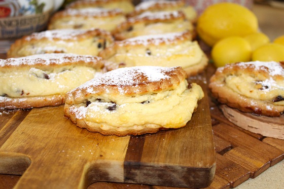 На одну половину заготовки выкладываем (щедро) творожную начинку и накрываем второй половиной теста. Смазываем желтком, смешанным с молоком