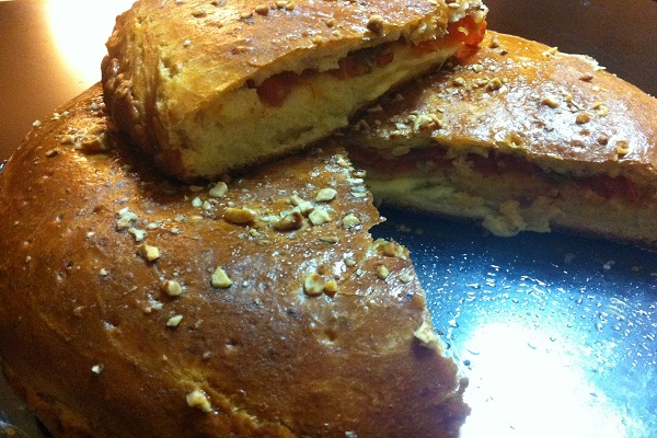 Хлеб - это, конечно, сильно сказано! Это скорее пирожок с сырными прослойками. Однозначно вкусно! Надо: дрожжевое тесто, любое, грамм 800, сыр 150 200 грамм, сливочное масло - 50 грамм, чеснок один зубчик, щепотка крупной соли, орешки (у меня фундук) и помидоры 1-2 зависит от размера (можно вяленые). Помидоры режем на тонкие круглешки, крадем на противень, взбрызгиваем оливковым маслом, сахарим (обязательно) чуть присаливаем, посыпаем травами и чесноком, запекаем в духовке на 100 градусах, до выпаривания лишней жидкости.