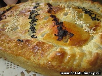 Сверху тонкий слой слоеного теста. Края плотно защипываем.