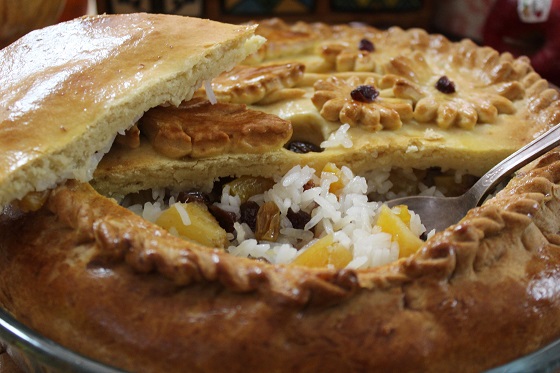 Можно подавать и остывшим. И тут уж можно и из формы достать и резать как пирог... на аппетитные ломтики. В любом случае очень вкусно получается. Сочно, рис и сухофрукты набухшие, пропитанные и прямо даже какие то сытые от сливочного масла. Тесто нежное, чуть хрустящее, пористое. Обязательно попробуйте. быстро и очень вкусно. Удачной Вам выпечки и приятного аппетита!