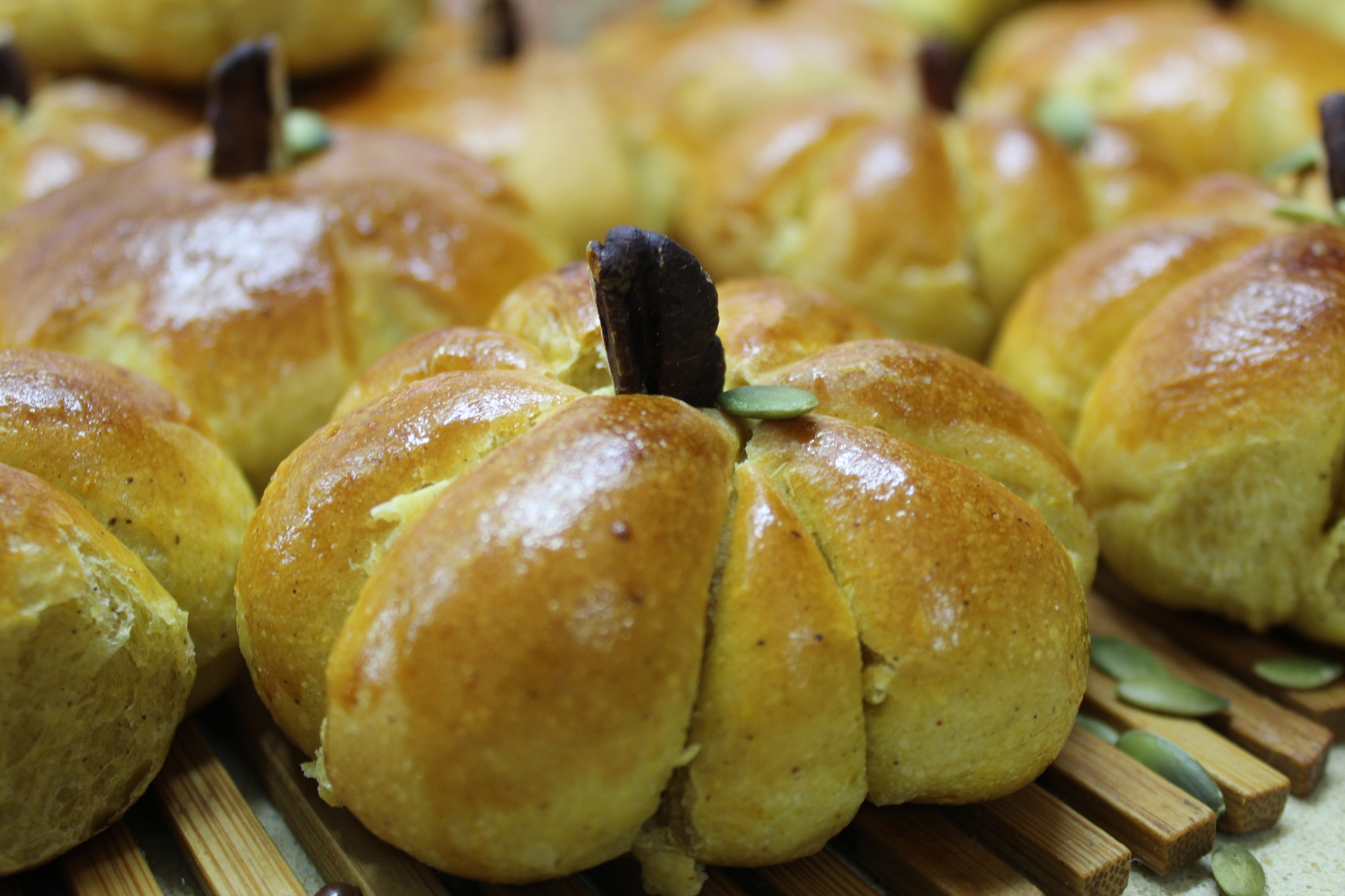Или перевязываем крест на крест ... пищевой нитью, придавая булочкам очертания тыквы.