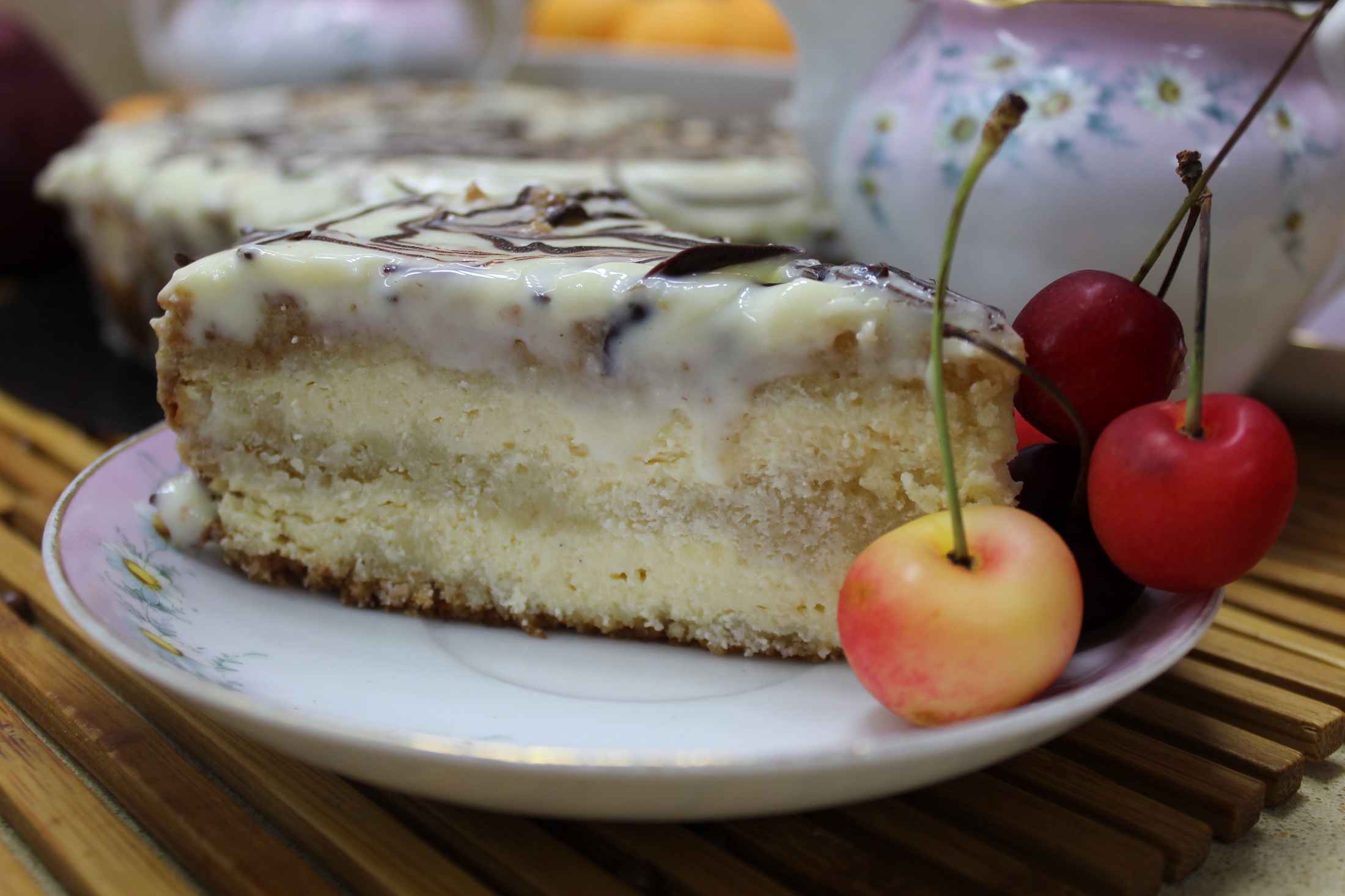 И можно подавать. Вот такой ароматный, нежно творожный, с легким привкусом ванили, с хрустящими прослойками и немного кисловато сладким шоколадным кремом. Вкусно и просто! Скажу честно, я всегда часть муки заменяю на кокосовую стружку, при возможности на ореховую... Дети мимо такого пирога никогда не проходят... Да и взрослые тоже. Такой вот простой и вкусный венгерский ответ чизкейку. Ну ничем не уступает! Угощайтесь! И приятного Вам аппетита!