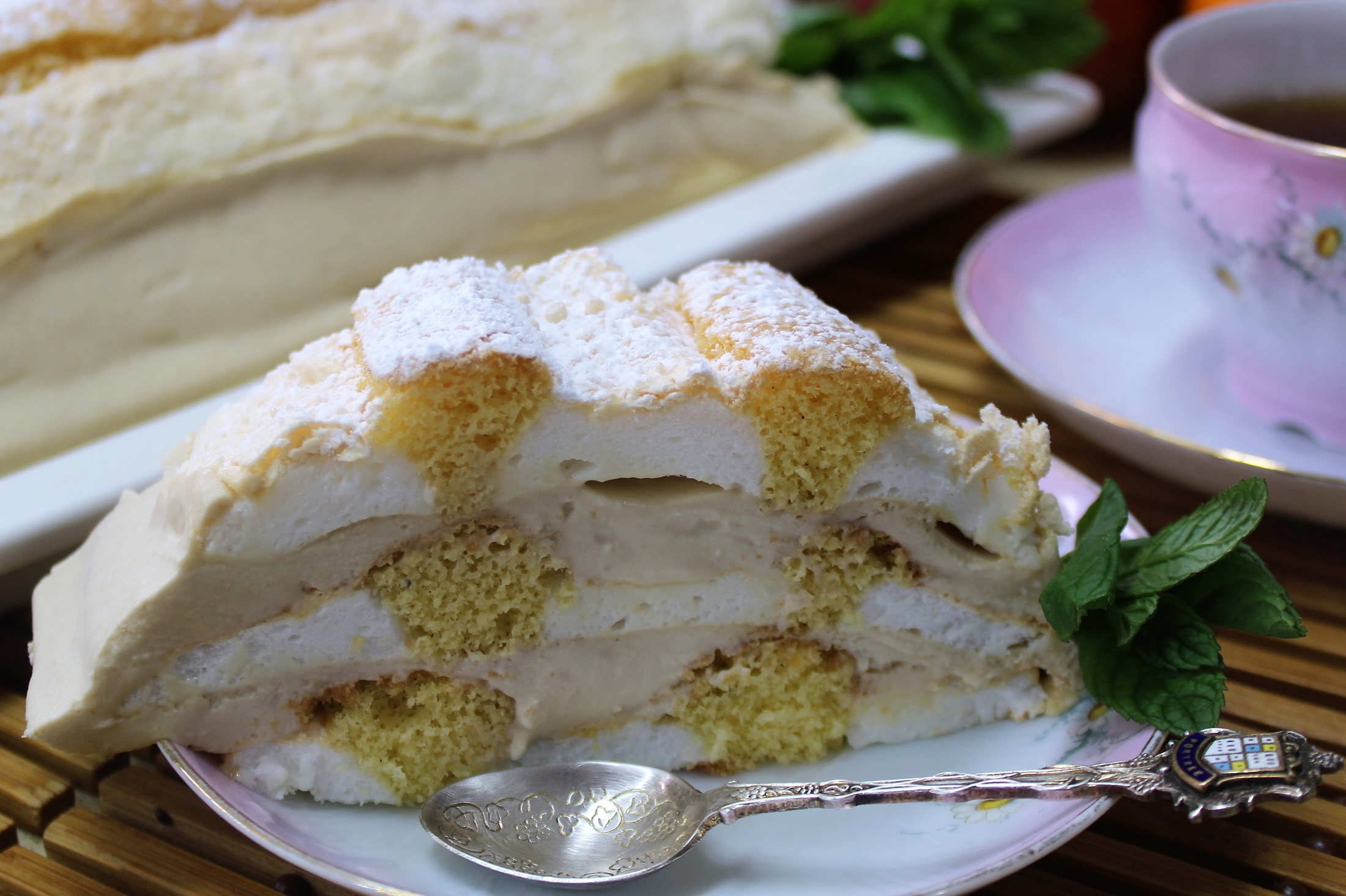 отсаживаем его между безовыми полосками, формируя корж где 3 полоски - меренга и 2 полоски - бисквит. Сверху присыпаем сахарной пудрой и несем выпекать на 160 градусах минут 20-30.
