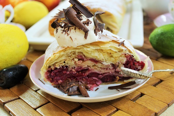 Когда остынет со взбитыми сливками. Это очень вкусно. Изумительная вишня смешанная с орешками... сливочность и карамельность (от расплавленного сахара) тончайшего хрустящего теста. И всего несколько свободных минут для того, чтобы так себя порадовать! Пеките не сомневайтесь. Удачной Вам выпечки и приятного аппетита!